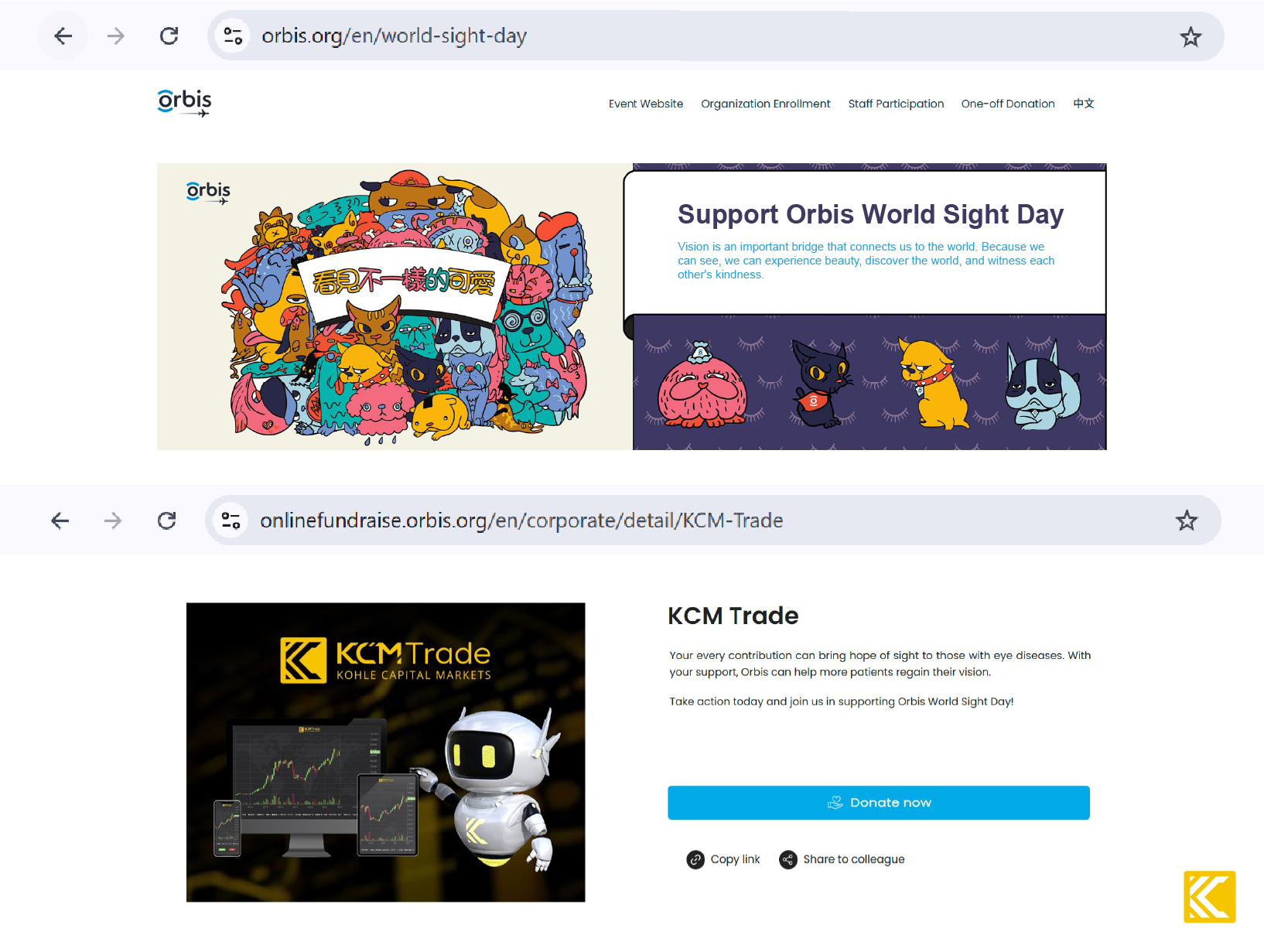 Staying true to its commitment to corporate social responsibility, KCM Trade actively supports global talent development, community and cultural exchange, child welfare, and environmental protection, with footprints spanning Hong Kong, Australia, Thailand, and beyond. This year, the Group is proud to participate in Orbis World Sight Day 2025 on 9 October 2025, an event dedicated to raising global awareness of eye health and preventing avoidable blindness, while helping underprivileged communities gain access to proper treatment.